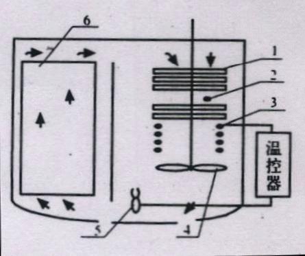 為保證工作區(qū)內介質的溫度穩(wěn)定和均勻,我們選用側向攪拌的槽體結構方案,下面按工作介質在槽中流動過程來說明恒溫槽工作原理:在攪拌(4)推動下,工作介質在混合區(qū)(2)內自上而下流動,先經(jīng)盤管蒸發(fā)器(1)和加熱器(3)進行熱交換,使流動介質達到某一合適溫度后,由攪拌器進行強烈攪動,使溫度不甚均勻的介質充分混合,進而推動介質從底部流出,再導流向上進入工作區(qū)(6),并使介質具有一定的流速。在流經(jīng)工作區(qū)過程中,要求介質盡量減少與外界的熱交換,這樣才能保證工作區(qū)介質溫度均勻,并為高質量溫度控制創(chuàng)造良好的條件,此后,介質再流進混合區(qū),依次作重復的循環(huán)流動。溫控系統(tǒng)的感溫元件(5)置于流體之中,用于測量溫度信號,控溫系統(tǒng)根據(jù)感溫元件所測得的溫度變化,調節(jié)輸出脈沖信號,最后驅動雙向可控硅推動加熱器加熱,實現(xiàn)控制槽溫在設定溫度下工作。